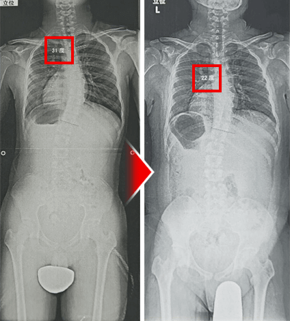 医師も驚愕した治療効果。レントゲンでも明らかな変化が見られ、コブ角が31度から22度になり側弯症が治りました。