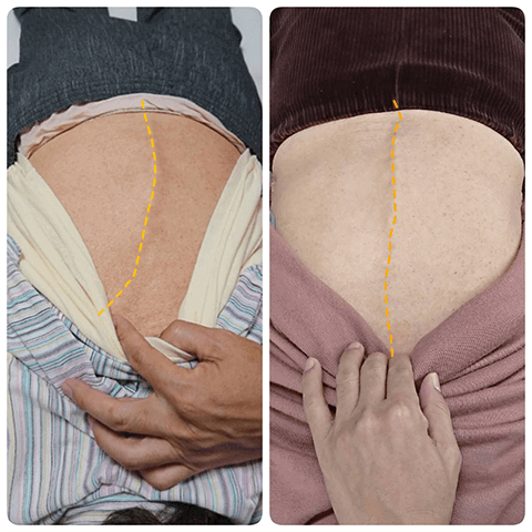 この治療法を2回受けた後の側弯症の変化です。背骨の変形を直に確かめても、C型の側弯がまっすぐに変化しています。