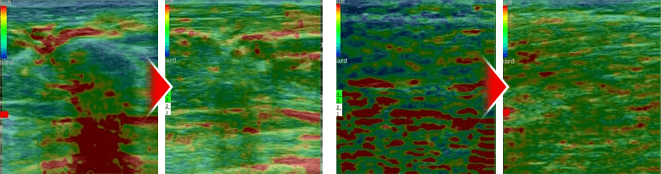 組織の硬さを色で表す最新のエコー機器「エラストグラフィー」でも高い筋弛緩効果が証明されました。硬い筋肉が青、弱化しすぎた筋肉が赤、筋肉バランスが最も整った筋肉が緑で表示されるのですが、施術前は青い面積と赤い面積が目立ったのに対して施術後は青い面積が減り、バランスの良い筋肉の状態である緑の面積が増加しています。これは、硬い筋肉が弛緩し、弱化しすぎた筋肉が復活したことで、全体的にバランスの良い筋肉の状態に整ったことを表します。