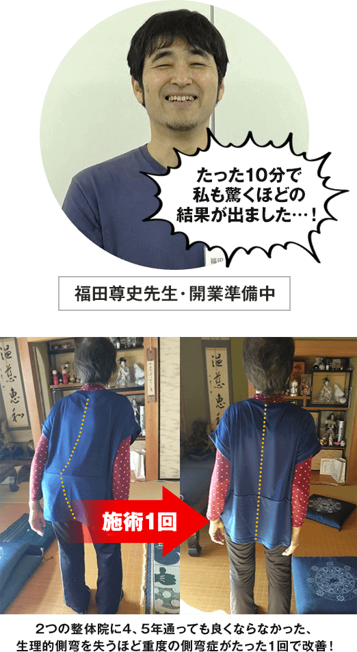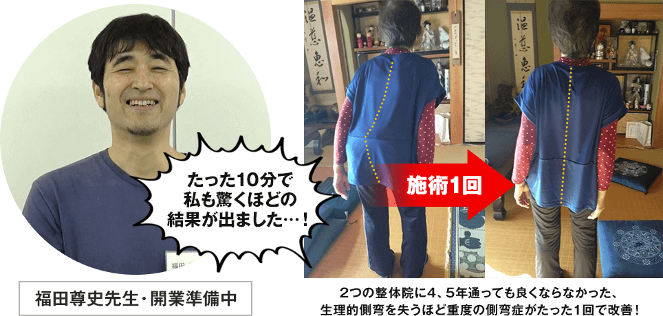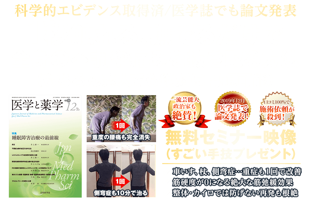 誰が見ても骨格の異常としか思えないようなグニャリと折れ曲がった側弯症患者さんや、手術宣告を受ける程重度なガチガチに固まった腰痛、五十肩患者さんでも、【たった1回】の施術によって劇的に改善させることができます。