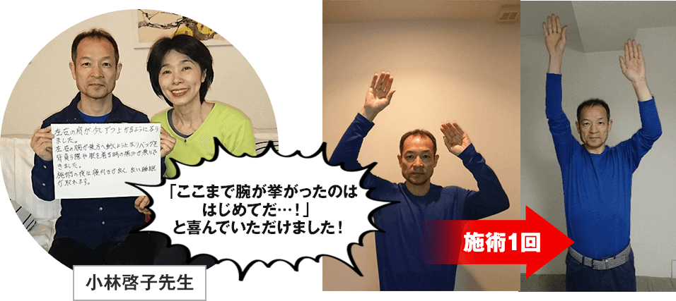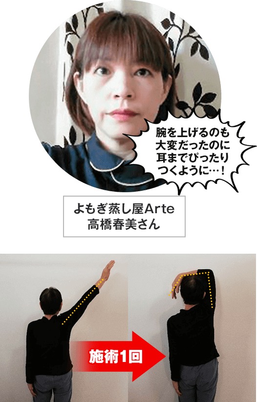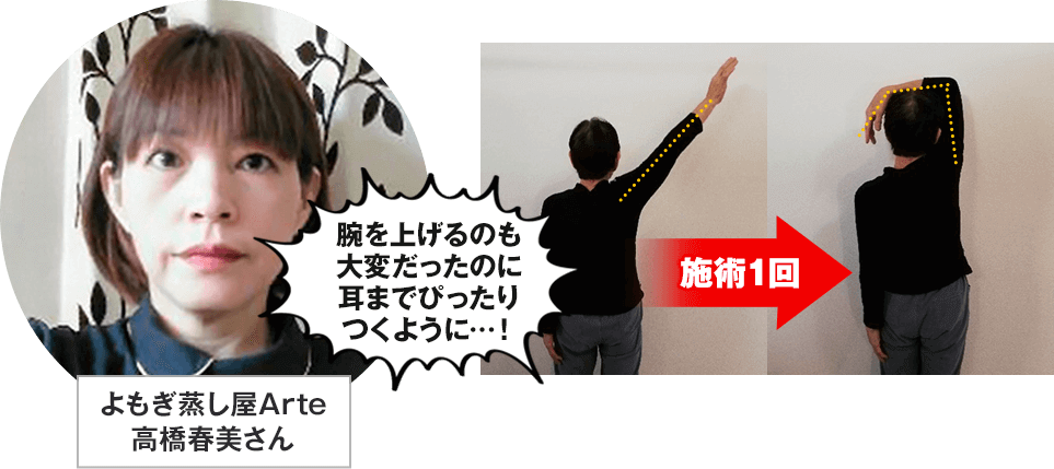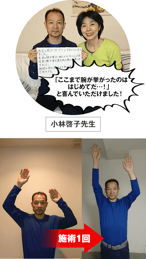 超重症な四十肩・五十肩の高齢患者さんでも引っ掛かりをほとんど感じない状態まで1回で改善します。どれだけ筋肉が緊張・拘縮していたとしても、いとも簡単にグニャグニャに弛緩できます。