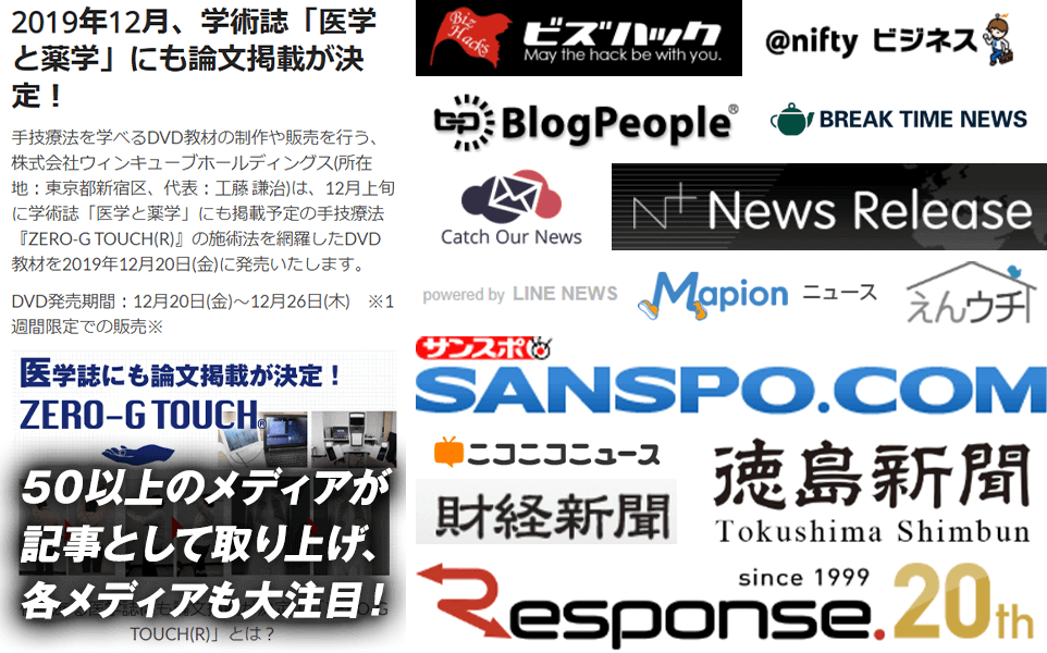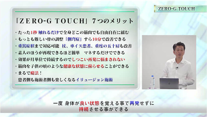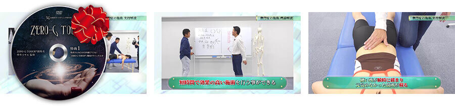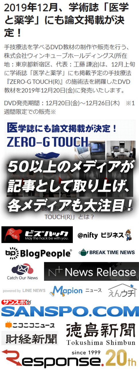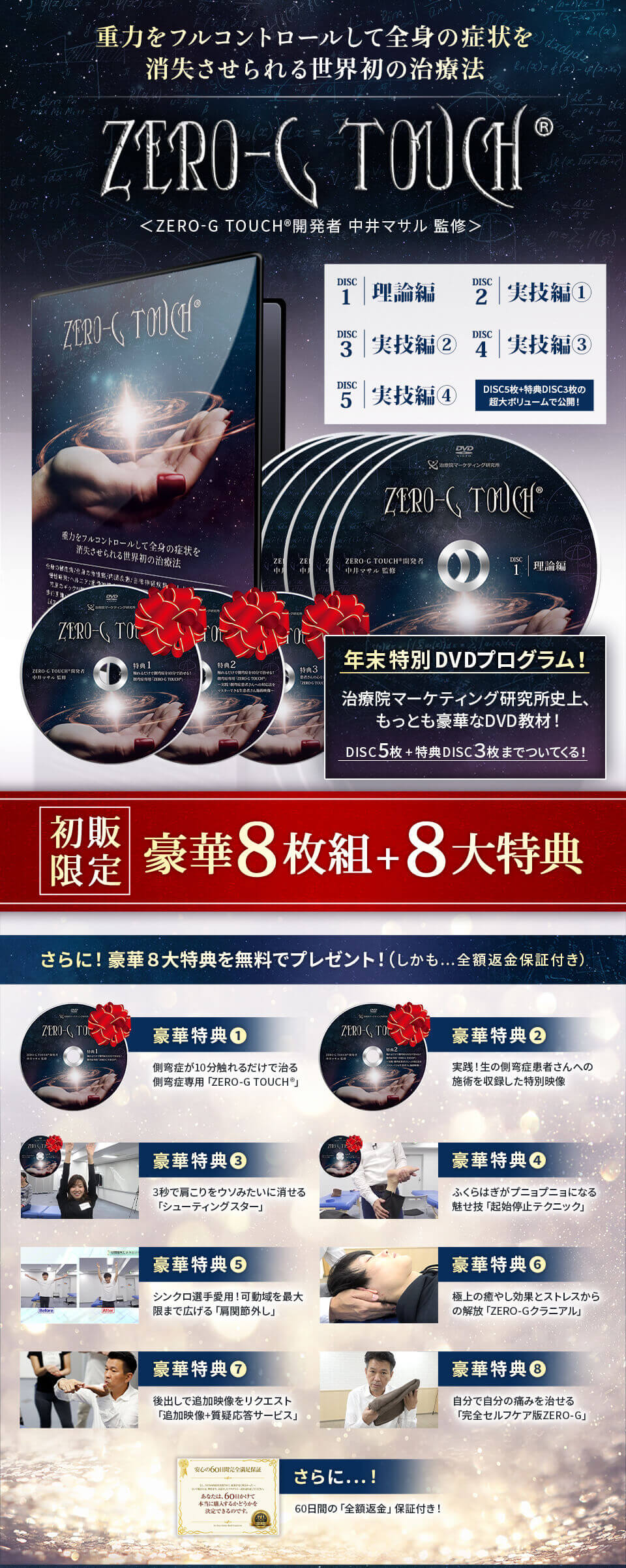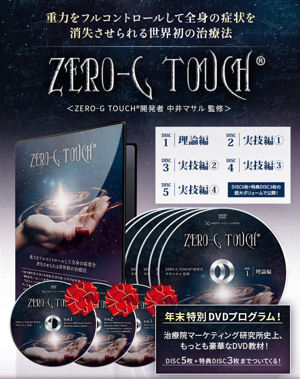 今回発表した「ZERO-G TOUCH®」は世界で始めて重力をフルコントロールして全身の痛みや不調、ストレスを消失させられる医学誌にも掲載された治療法のすべてが収録された唯一のDVDです。