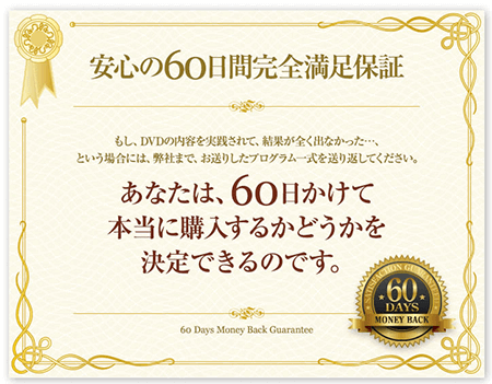 | 特別サポート ノーリスクでお試しください!万が一満足できなかった場合 無条件でDVD代金が返ってくる60日間の100%全額返金保証付き |