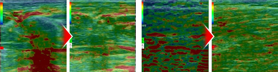 組織の硬さを色で表す最新のエコー機器「エラストグラフィー」でも高い筋弛緩効果が証明されました。
