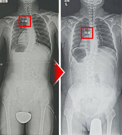 医師も驚愕した治療効果。レントゲンでも明らかな変化が見られ、コブ角が31度から22度になり側弯症が治りました。
