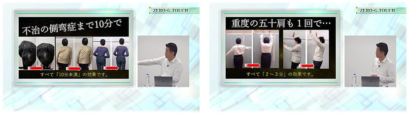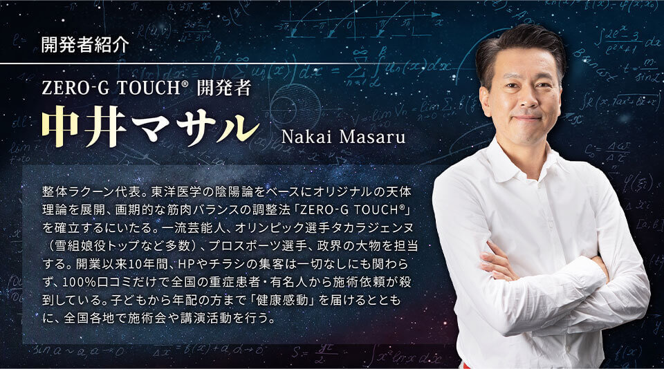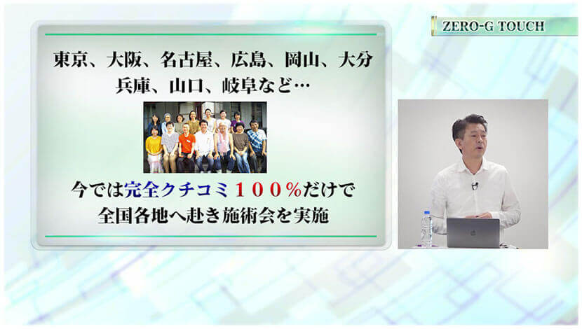 そして何より、「ZERO-G TOUCH®」は整体師、柔整師、鍼灸師、マッサージ師、エステティシャン、まったくの素人の方まで…どんな方にも再現できるほど簡単かつ、結果の出る治療法です。この再現性の高さこそ、「ZERO-G TOUCH®」の最大の魅力ではないかと考えております。