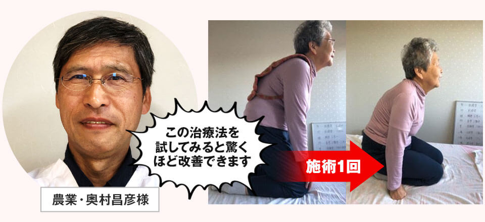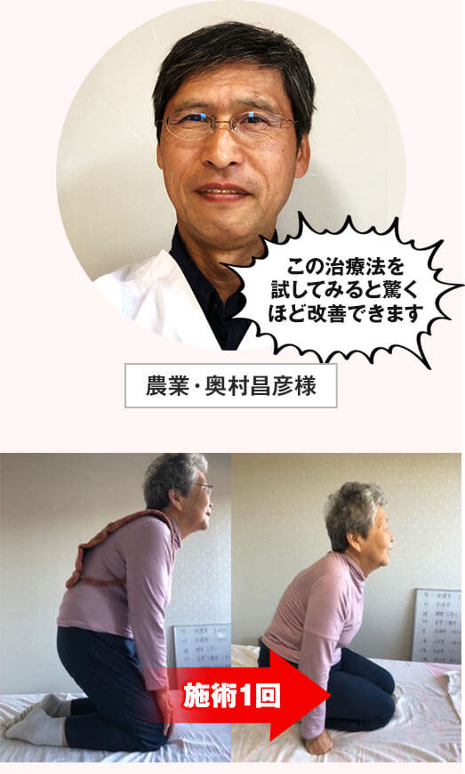 ボルトの入った腰痛患者から、まったく腰が伸ばせないギックリ腰、脚を引きずるほどの膝痛まで、どんな重度の痛みや可動域制限も、