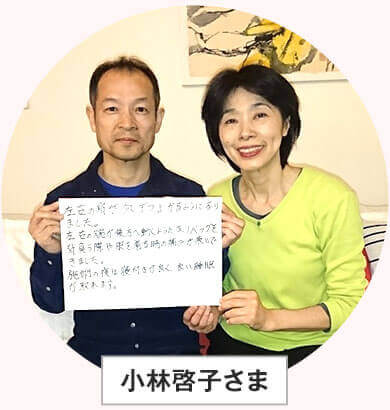 この施術は他にはない独特な方法であり、大変効果があると毎回感じています。これからも受け続けたいです。